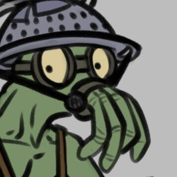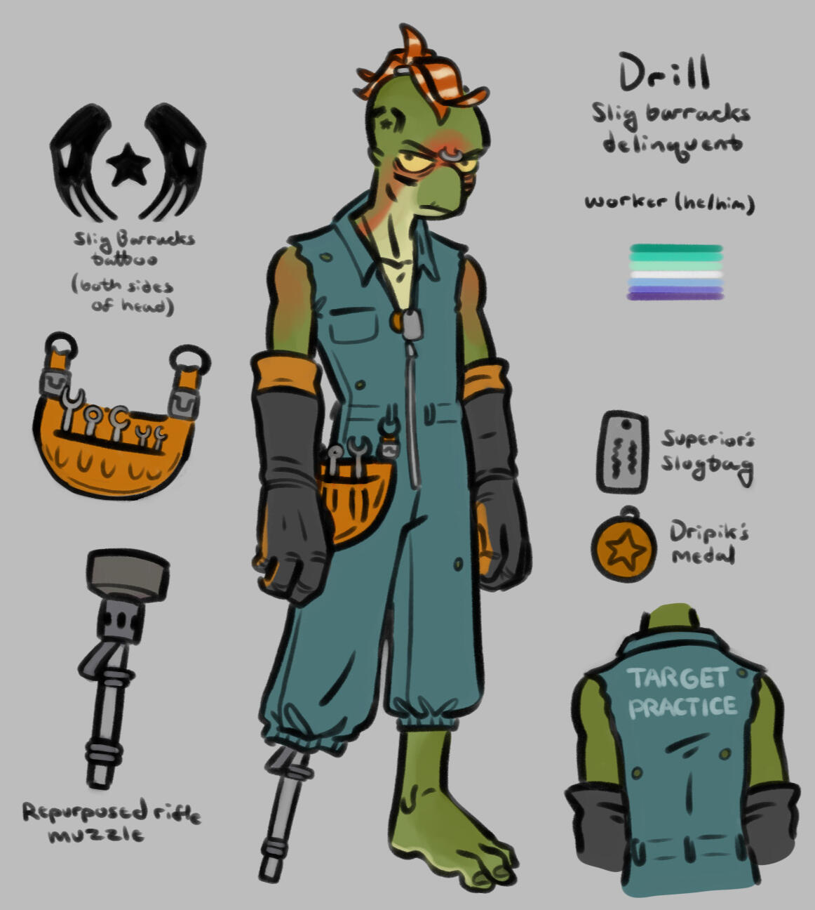 He was mockingly given the nickname “Drill” by the other Mudokon delinquents in the Barracks. Drill insists that the nickname comes from his job as a maintenance Mud and skill with power tools, but the nickname actually stuck as a result of his constant insulting and scolding of other Muds much older and larger than him, with a confident gusto not unlike the drill sergeants they were faced with every day.The “Target Practice” jumpsuit is standard issue for Mudokons in the Delinquent Camp. The Sligs in the Barracks entertained themselves greatly by aiming directly for Drills peg leg every time he was sent out on the shooting range to pick up bullet shells. It became a game for them. After going through leg after leg made of rusty rods leftover from outposts and wrappings made from empty sandbags, Drill eventually started making his spare legs out of weapons that were tossed into the Barracks’ “discard pile” for reasons such as malfunction or obsoletion. Drill will darkly comment about how the guns his leg are made from are just like him, “thrown away for not working right.”When Abe first arrived at Slig Barracks on his mission to shut down SoulStorm Brewery 401, Drill had no interest in following Abe. He didn’t believe in some Messiah, and he certainly didn’t believe in blindly following some leader to become an off the grid hippie. The murder of General Dripik cracked Drill’s skepticism. He still didn’t believe in Abe’s prophecy, but Howler's grit won him over. He decided to trust Abe and Howler and go with them on their journey (after stocking up on an overly excessive amount of stolen Slig artillery per Howler’s request, much to the dismay of Abe). He was sent through a bird portal by Abe after the death of Vice President Aslik. Freedom however, did not result in Drill’s attitude improving. If anything it got worse. After the Brewery’s destruction, Drill became the first official member of Howler’s “Rebel Defects”. He did not fit in well with the freemuds let alone the natives, he even managed to receive the luck of being the first Mudokon that was ever kicked out of Alf’s Rehab & Tea after giving the namesake proprietor a very harsh, unwarranted, but not dishonest tongue lashing. He began being turned away from most front doors, not that he seemed to care, but it was clear he didn’t fit in.He inadvertently joined Howler’s mission to assassinate her oppressors when she coaxed him into realizing they both wanted the same thing; to kill the Industrialists that murdered their childhoods, no matter how small or indirect a role they played in it. In order to convince him that Howler had his best interest in mind, she gave Drill her collection of General Dripik’s medals, a trophy she had taken from the Glukkon warmonger’s dead body the day that he had been murdered as an ironic quarmic vengeance on behalf of the spear belonging to her Drone Beget being turned into a centrepiece in Dripik’s trophy room. Giving up the medals to Drill was a meaningful gesture, as the murder of Dripik was something Howler had longed for since the Glukkon’s army razed her tribe into the ground and abducted her. The medals were, to her, a reminder that she had outlived him, her tribe had outlived him.Drill keeps the medals adorning whatever he can show them off on. He is the weapons specialist of the gang. Thanks to his non-consequential career in maintenance, excessive time spent in Slig Barracks, and his experience jury-rigging prosthetics out of reverse-engineered Slig weaponry, his knowledge of industrial firearms is practically unmatched. He is skilled with both a close range handgun and a long range sniper rifle, and can identify any bullet, even if the shell is mangled.As the youngest member of the gang he is constantly on edge about being patronized. Though Howler sees her younger teenage self in Drill, caring deeply for him and understanding his pain, the majority of their interactions result in arguments and insults thrown at one another. Thanks to the Delinquent Camp he is an expert at interrogation tactics and is quick to harshly clock people on their Slegshit, even his own gang. He does not respect Howler as a leader, and is the only member who tends to call her out when her motives are clearly favouring herself over others.His second closest relationship is with Trip Hazard, who trusts Drill the most when it comes to describing the appearance of things like dead Sligs; something the two of them both find quite hilarious.