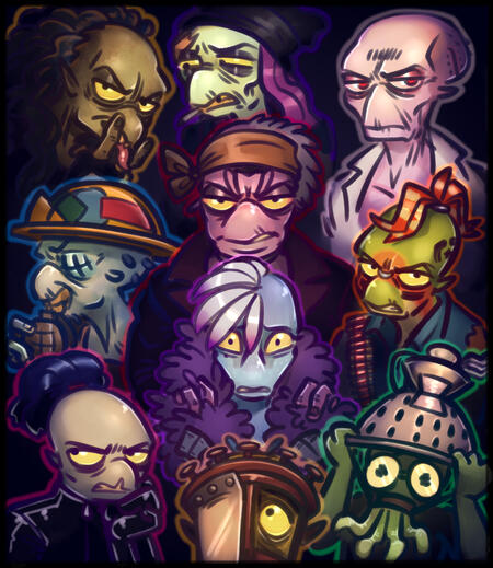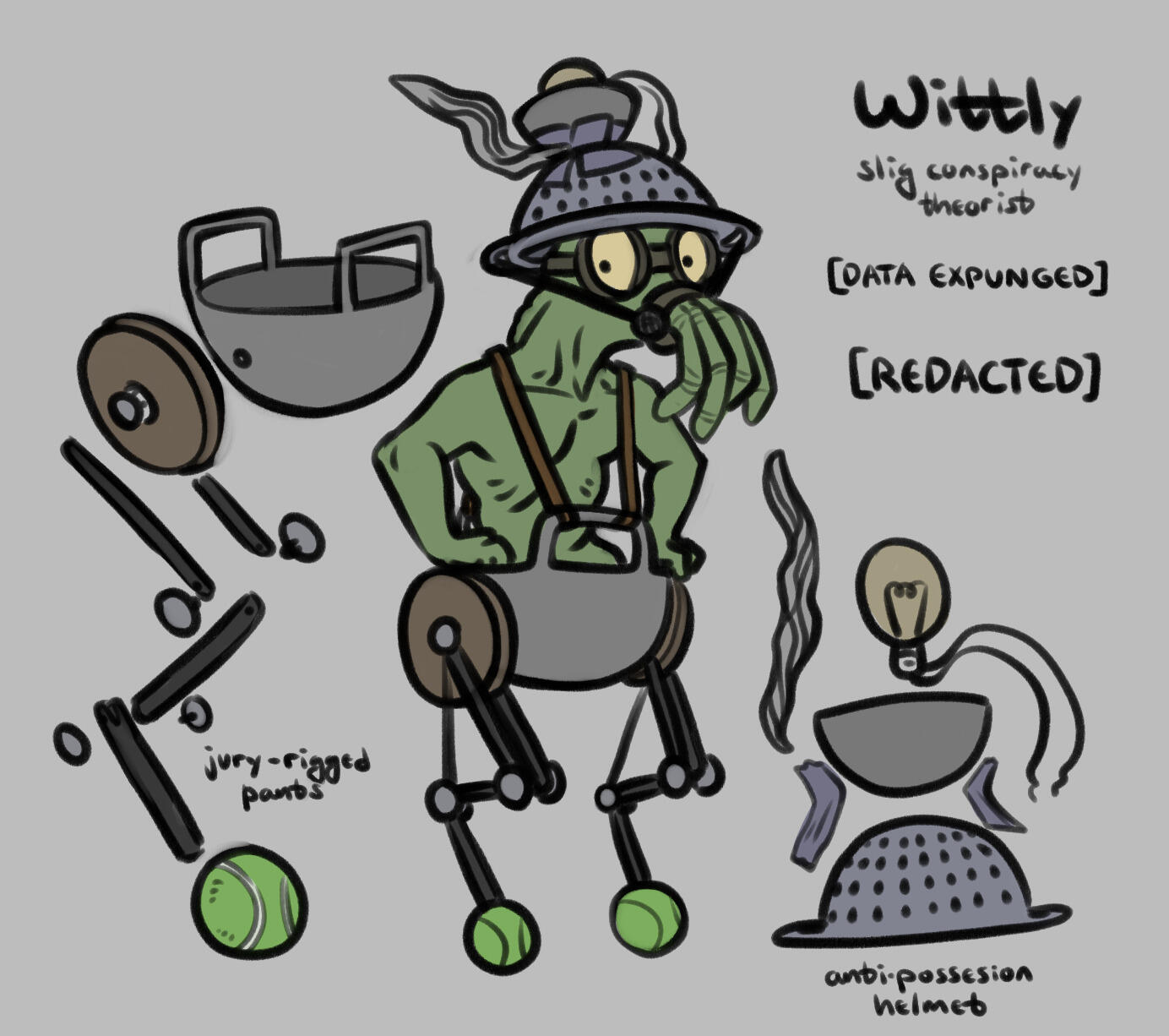 He is completely distrusting of the Cartel and all of its branches. His distrust is warranted of course, but it has also manifested into him developing extreme paranoia and obsessive compulsions about everything even remotely related to the Cartel. He even refuses to consume any foods approved by any Magog or Vykker divisions, not because he thinks the additives and microplastics are unhealthy, but because he believes that there are chemicals in the foods that will mess with things like his intelligence and sexuality. Wittly also believes that Slig Barracks mandated pants and goggles are equipped with mind controlling technology and therefore refuses to wear them whatsoever. He has slapped together his own homemade pants and goggles, as well as a helmet made from a strainer, tinfoil, and other junk that is intended to nullify his susceptibility to Mudokon mind control. Whether or not it works remains pretty unknown.While a lot of his theories are nonsense, some of them are pretty bang-on-the-Moolah. The Magog Cartel is aware of Wittly’s piracy and has attempted to shut it down in the past, but Wittly seemed prepared with backup everything, every time. It was soon decided by higher-ups in the Cartel to not bother with trying to shut the Slig down as they realized that trying to interrupt the broadcasts would fail in suppressing rumours. The Cartel knew if they actually did silence Wittly, it might cause more people to actually start believing some of the things said by him. Wittly often says during broadcasts that he knows “Cartel agents” are listening (and they are), but thanks to his accurate suspicions being mixed in with gobbledygook there is never any intervention.When the rumours about Abe the Mudokon’s uprising began to spread, Wittly believed they were the complete truth-especially since he suspected pretty early on that the Cartel was attempting to cover it up and suppress all talk of it. In fact, for some Sligs and Mudokons, the pirate broadcasts were how they first received word of Abe. Despite his conspiratorial beliefs, Wittly does not see Abe as a hero. His paranoia and distrust of Mudokons is unfortunately shaped by the very Cartel he despises, and he has fallen for every nutjob pseudo-archaeological claim that Mudokons aren’t simply in tune with the magic of nature and spirits, but are the descendants of gods from another planet. He believes the Mudokon Moon is actually a signal from extraterrestrials calling for their “people” to return. He has even discussed theories on his broadcast that there are ancient Utopian cities built under the temples of Scrabania.Trip Hazard was one of the many ironic fans of Wittly’s show. Despite the poor signal it managed to be the one and only radio station Trip was able to tune into all the way down in Necrum Mines, for some reason. When Howler’s gang formed and began their first acts of rebellious terrorism, the Magog Cartel was quick to suppress rumours and downplay the amount of destruction caused by the gang in news publications in order to decrease public panic. Wittly however was onto them from the start. Trip was eager to tune in and hear what the nutty Slig had to say about it. It became a habit for the gang to listen in on Wittly, until one day while listening, Howler keenly noticed that he was jabbering on about a lot of information on Cartel branch executives that would be really handy to them. He even apparently knew information on Corrective facilities that Howler knew for certain wasn’t even common knowledge among most Sligs that worked in and out of it. Wittly’s obsessive paranoia meant he miraculously had informative tabs on people Howler had on her hitlist. She knew the gang needed him.After an abrupt kidnapping and convincing Wittly that they weren’t there to infect his mind with Brain Slurgs, the gang had their sixth member. Wittly’s in-and-out knowledge of Magog technology, navigating the Webb incognito, and techniques in scrambling transmissions comes quite in handy.