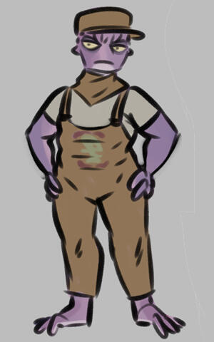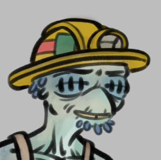Ever since he was a hatchling, he never looked where he was going and was always stumbling about in the way of others, earning himself the nickname “Trip Hazard”. After spending his able-bodied years slaving away with explosives in various locations under the orders of SoulStorm Mining Co., he was eventually shipped off to Necrum Mines under the facade of a “promotion”. It became clear to Trip that this was a lie when he was knocked unconscious and had his eyelids sewn shut before being thrown into a Cheapo Labour train car without any care whatsoever.Mudokon slave miners in the lowest levels of Necrum are all surgically blinded before they are stationed there, for various reasons. One being that any burial offerings dug up by the slaves are confiscated and sold to Industrialist museums as “excavated artifacts”. Deprivation of sight ensures the slaves don’t have the chance of seeing anything valuable while they’re digging and trying to pocket them. Also, if they become aware what species the bones they’re ordered to dig up belongs to it would likely cause the workers great moral distress, which could lead to panic attacks or suicide, and their bosses don’t want to deal with that paperwork. The blinded slaves are also deprived of sunlight as they are never permitted to leave the low tunnels of the mine. The lack of sunlight and oxygen causes their skin to become very thin and pale. If a blinded slave was even seen at a glance by someone who wasn’t supposed to see them, it would be a PR nightmare for the mining company, so they’re kept underground, essentially until they die and become the very bones being dug up. In short, slave miners being promoted to work in Necrum Mines are being sentenced to death.Trip Hazard was always very aware that Necrum would become his grave, but always remains very lighthearted about it all. He was well known by his coworkers before for his sense of humour, always cracking jokes even in the most dire of situations. When dumped off at Necrum he was typically working on his lonesome by order of Morguer, who demanded that all explosive technicians be sent on location alone in order to minimize casualties. Trip was fully expected to die on multiple occasions, but he has managed to evade death every time with a smile on his face and a bird flipped to his Slig supervisor.Explosives remained Trip’s one and only comfort. He was already half deaf due to his work and was now fully blind, meaning he couldn’t at all see the bright fiery clouds and couldn’t much hear the boom beyond a ringing in his ears. However he could still feel the explosions. The vibrations in his bones that shot through him after detonation were more familiar to him than a cold Brew or a good night's sleep. He often mentions that his lifelong dream is to go out with a bang in the biggest, brightest, most destructive explosion possible and that all the previous explosions he’s been in “clearly weren’t sexy enough”.When Abe caused Necrum Mines to cave in, it was Trip Hazard himself who aided in laying the explosives to do so. Unlike Drill, Trip Hazard didn’t hesitate when offered rescue by Abe. However, not unlike Drill, he didn’t fit in with the other freemuds and natives well. Not many of the blinded Mudokons did as the tribes themselves weren’t used to large populations of disabled and were not equipped to provide them necessary aid. Trip’s age didn’t do himself any favours either. As a crotchety blind old Mud, he expected to be treated with respect by the tribes as they seemed to value their elders. The contrary proved quickly true. His status, not only as a factory-hatched Mud but one that contributed to the “defiling of Necrum” earned him frequent disrespect and saliva spat in his direction by Posers, Kahonees and Shamans.He quickly learned that the only place he was truly welcome was in Howler’s circle of screw-ups, and when the offer to join her mission of retribution was given to him he jumped to take it.His contribution to the Rebel Defects is his both his nasty sense of humour and expertise in explosives. When rescued from Necrum he made sure he took as much dynamite as he could with him, “just in case” as he put it. He always seems to have the exact explosive the gang needs, whenever, wherever, however, just by reaching in and pulling it out.The mining hardhat Trip wears has a broken light. Trip is unaware it’s broken and still switches it on whenever entering any dark areas with the gang, despite the fact he wouldn’t even be able to see with the light anyway. It’s merely a habit he never let go.He also carries with him a shovel he uses as a walking stick, perfectly indented with the shape of a Slig’s skull- one that had cornered Howler the day that Abe had come to the mines. Trip gave the Slig a quick whack knocking him dead to the ground, an act which stood as his first introduction to Howler and the Mudokon Messiah himself.Trip’s strongest relationship is with Slogmeat. He is completely oblivious to the fact Slogmeat isn’t actually a Slog. The gang doesn’t bother to correct him because Trip doesn’t believe them when they say Slogmeat is a Mudokon.