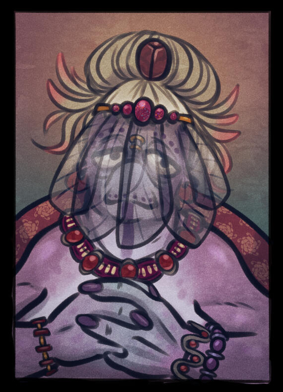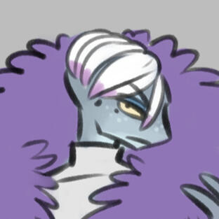Darling began life as Max, a bright but unassuming indentured child laborer working on the crew of a Nolybab daytime television studio. Whilst working on set filming an interview, the young mud’s purple feathers caught the eye of the interviewee: the fashion magnate Mizz Malthea Mayven Uggae. Before the interview was over, the Prima Glokka had Max’s life signed over to her estate, and the rest was history. The Mudokon known as Max was no more, and in his place was Mayven’s newest project: Darling.Over the course of growing up at Mayven’s side, Darling would go through countless surgical procedures to shape her into a more fashionable specimen than the plain little boy she used to be. In the end, the only thing that was still originally hers was her feathers; those were regularly plucked and regrown at Mayven’s behest, to provide all-natural materials for her new feather stole. This was the real project Mayven was spending her free time on, not Darling. Nevertheless, Darling worked herself to the bone to be the perfect handservant and companion to her Mistress, in hopes that she would still have a place at her side long after the stole was finished.As the years went by, Darling would go through countless faces to keep up with the Vykker-run beauty standards of crimps. Becoming something unrecognizable in the mirror didn’t bother Darling, who had willingly carved parts of herself away to fit the mold Mayven didn’t even order her to fill. Anything to have meaning in her life, deprived of the mental stimulation and creativity that her brilliant mind craved. Not wanting to bother with a stressed out mud, Mayven did what any slave owner with a limitless budget would do, and had a custom domestic Shrink ordered to be Darling’s new handler. Within twenty minutes of meeting her Shrink ‘Angel’, Darling had cracked open the parameters of its AI programming and ordered it to consent to her taking it apart.As Mayven was often absent from her own mansion on endless strings of business trips, social gatherings and extended vacations, Darling was often left behind to look after the estate. While she enjoyed having the privacy to continue tinkering with her Shrink, she craved the validation of her Mistress more than anything. Visits from Mayven became fewer and farther in between, and her attitude towards her own servant was dismissive at best. The only semblance of attention she spared her was to keep taking her feathers, but as the repeated plucking went on, fewer feathers were growing back. After a series of hit-or-miss feather treatments, Darling’s scalp had been left worse for wear. Still, she endeavored to provide for her Mistress’ personal project, even if her paranoia over being simply discarded grew.As the stole neared completion, Darling’s mental state worsened. Her paranoia and delusional symptoms were caught early by her shrink’s assessment, but in her fear of being replaced, Darling reprogrammed the Shrink to give her a perfectly clean bill of mental health upon reporting to Mayven. Darling’s issues were left to simmer, until at all came to a head upon one rare visit by her Mistress.It is uncertain what happened to Mayven, as Darling wasn’t in a lucid state of mind by the time she had the scissors in her hand. She killed the Mistress she loved, feared, and hated with equal measure, but it did not free her. No one like Darling could ever be ‘free’, changed too drastically both physically and psychologically to be the perfect, neglected pet she had become. So, she did the only thing that made sense to do: simply make it as though nothing ever happened to Mayven at all.For a savant like Darling, rigging a new AI out of Angel’s programming was almost too easy. Using recorded footage, clever editing, and utilizing Mayven’s famously busy schedule, she could digitally take Mayven’s place from the comfort of her own room. For the next six years, Darling and Angel would co-opt the Mayven persona to attend her meetings, conduct her business deals, and even arrange her personal affairs with Glukkon men. No one was the wiser, because after all, Darling was only one Mudokon - one very smart, very cunning Mudokon, who would do anything to keep the status quo.Darling had traded her freedom for Mayven’s life, though not in the way she intended. Even in death, her Mistress ran her life to the most minute detail; everything Darling did was in service to keeping up the grift of Mayven’s ‘life’, while Darling herself continued to languish away in a room she would never leave. Her Shrink, no longer her caretaker, had been reprogrammed into an idealized, sycophantic version of Mayven that would love Darling back, just as she always wanted. To her, this ghost occupying the robotic shell was more real to her than the memory of a dead woman who only ever neglected her.Darling was prepared to die keeping up this grift for the rest of her days, until the cracks in the facade became apparent to the even more paranoid and deranged conspiracist Wittly, who brought ‘Mayven’ to the attention of the Rebel Defects. While they infiltrated Mayven’s estate looking for answers, they didn’t realize they would be led to a single, self-imposed hermit of a crimp, conducting Mayven’s ‘lie’ through a wall of computer screens. They also didn’t realize that they may as well have saved Darling’s life.