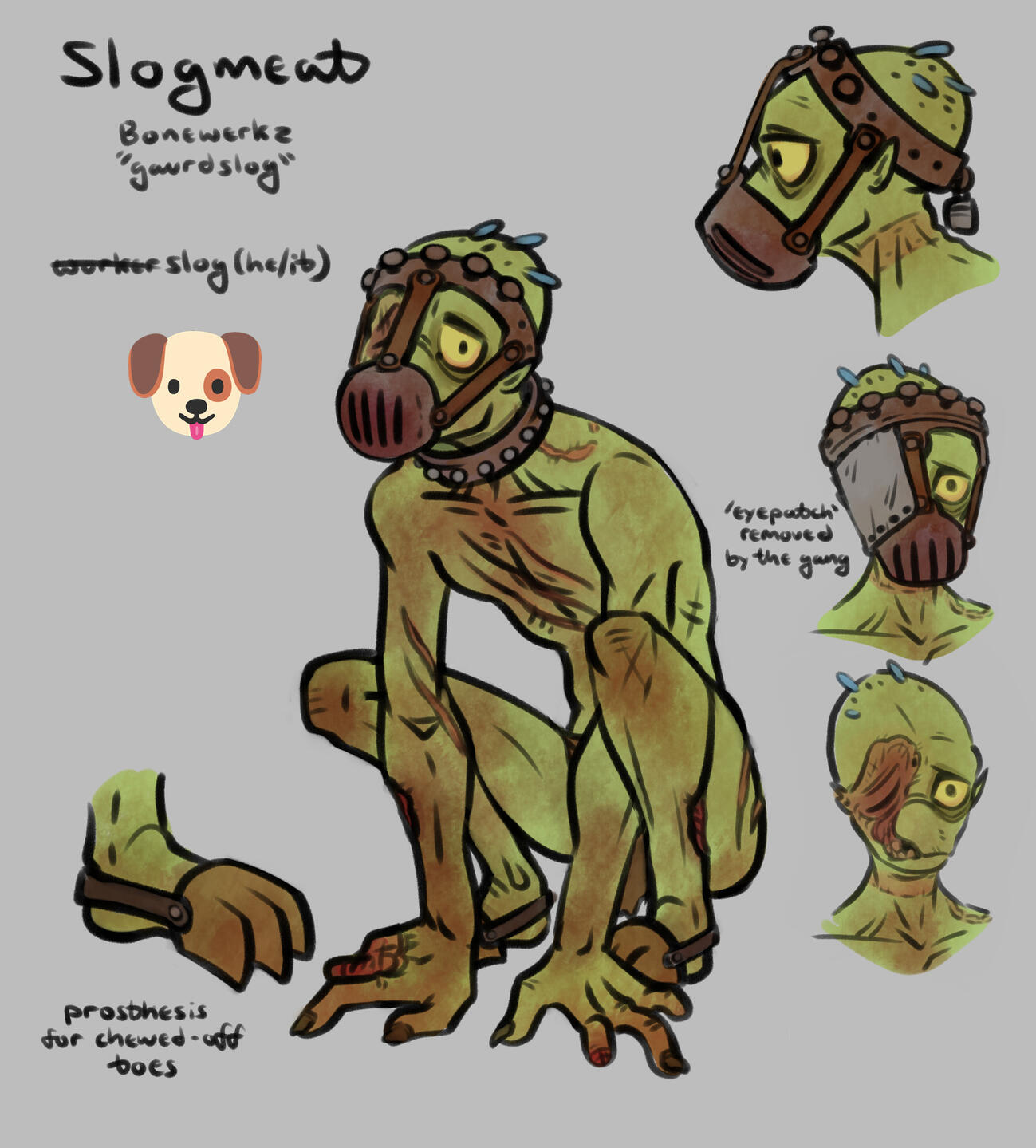 Slogmeat’s true origins are shrouded in mystery. The gang has no idea what his name is, or if he even has one. All that is known about him is that when he was a child, he was tossed into the Slog kennels of Bonewerkz. While it’s likely that he was left there assigned to the role of shovelling up offal and feces left by the Slogs, it was commonly joked about amongst other workers that he was intended to serve as food for the animals, and truthfully the more likely case. Hence why most employees and security referred to him as “the Slogmeat”, seeing him as less of a sentient being and more of a mindless creature.Sligs themselves contributed to Slogmeats delusions, having essentially raised him from childhood exactly like they raised Sloggies as a form of humiliation and bullying. They kicked him, beat him, kept him chained in the pens, fed him Slog food, and even forced him to respond to commands like a Slog would. Slogmeat however, has managed to survive despite his circumstances, although not without consequences. Besides the various injuries and chewed off chunks of himself, he has developed a sort of familial relationship with Slogs. This comes more from being considered one of them, rather than by any training or discipline. Since he spent his formative years among the animals, he himself doesn’t recognize himself as a Mudokon. He is a Slog in his own mind. He moves like one, thinks like one, barks like one, and, thanks to his size compared to the other Slogs, he has assumed the role as the Alpha among them, saving him from being on the receiving end of a lot of vicious attacks.Other Bonewerkz employees would often share urban legends about Slogmeat to the point where scrubs were debating his existence. He was spoken about more as if he were some sort of cryptid lurking around the factory at night. Sometimes the Sligs would play along just to freak others out, and when scrubs were assigned with Sloghut cleaning duty, they were told to “watch out for the Slogs, but especially the Slogmeat”. Scrubs sent to the Sloghuts to clean them were given that task as a sort of punishment and did not come out in one piece, let alone alive. They doubled as cleaners and dinner to Slogs.During the revolt, Slogmeat was found by Abe in a Sloghut, chained up, beaten, bruised, feral and mauled beyond recognition. At first glance Abe had assumed him to be a mutant Slog rather than a mutilated Mud. Slogmeat had no desire to be rescued, not recognizing the Messiah as kin at all. All the years of abuse made him incapable of even understanding any words spoken to him that weren’t his trained commands. He was rescued against his will.Among the Freemuds, Slogmeat was the furthest from free. He was considered just as much of a mutant as he was back in Bonewerkz. He was still unable to see any Muds as kin, and after several visits from Shamans attempting to essentially exorcise whatever “vicious Slog spirit” had possessed him, he was deemed a lost cause. He is far more content living as an animal rather than a Mud due to his mind being completely gone.Though he assumes the role in the gang as a “bodyguard”, he is more accurately a guard Slog. His ability to communicate with other Slogs comes in incredibly handy. During the Rebel Defects endeavours, they have come across many Sloghuts with angry animals within. While Abe was quick to use Astra Kata and other problem solving skills to sneak through any areas filled with Slogs, Slogmeat would instead use his stance as an “Alpha” to communicate with his brethren, earning their trust toward Howler’s gang, and promising them through some persuasive barks and growls that they would receive not only freedom, but a chance to exact revenge on the Sligs that have been abusing them. Anywhere there are Slogs, it won’t be long before Slogmeat has them on a collar and chain connected to his own.Slogmeat doesn’t typically get along with Mudokons, but maintains the closest and strongest relationship with Trip Hazard, who doesn’t realize the feral Mud isn’t actually a Slog. Even though Trip is always eager to hear the sounds of the gangs feral beast mauling the organs out of a security guard, he isn’t afraid to let Slogmeat rest in his lap and makes it a habit to hold long conversations with Slogmeat even though the latter is unable to understand nor respond to him. But Slogmeat is able to sense the friendship between them, and if he were to consider anybody an “Owner” it would be Trip, who in turn considers him “Mud’s best friend”.