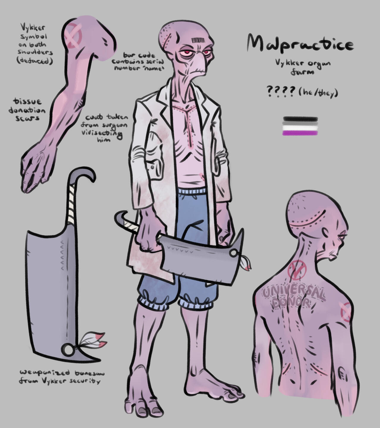 Mal wasn’t born, nor was he hatched, he was grown as a product of the Vykker Pharmaceuticals Universal Donor™ program, a horrific "medical breakthrough" that promised a consistent, conscious-free supply of transplant-ready organs that could be rented, leased, or sold. “75% ethically sourced Mudokon organ farms, incapable of conscious thought, pain, or suffering, for the discerning transplant recipient. All tissue is guaranteed cross-species compatible. Book a new liver or kidney today!” That’s what the brochure said. Mal was meant to be one of those, the 75%. Lifeless, unfeeling and disposable. But by a fluke, something didn’t take.When Howler’s gang raided one of the many Vykkers Labs in search for the notorious cosmetic surgeon Dr. Knicks, she instead found Malpractice on a steel table. Despite her first assumptions he was shockingly alive, eyes open, organs halfway removed, having been watching the procedure being performed on him in silence, before it was interrupted by gunshots. He sat up, gestured towards a suture kit, and stitched himself back together. Howler spoke to him, and it was the first time anyone had ever addressed him at all.His name comes from an identification tag that was tied to his toe, notifying the surgeon that was operating on him of something uncertain. Malpractice was the first word that Howler recognized. She asked the Mudokon if it was his name. Mal had never had a name before aside from the barcode identifier on his forehead, so he nodded.Mal is tall and bone-thin, stitched together like a ragdoll in surgical thread and steel staples. He’s a grotesque sight, the kind of figure even other Mudokons flinch away from. The Vykkers called him “it”, and the natives still do because they consider his existence “unnatural” due to having not been hatched from an egg.His gait is stiff, like he’s unused to moving under his own power (which is true). His muscles shouldn’t even work properly but, somehow, they do, and very well. Despite his stature his strength is impressive. He doesn’t feel pain due to his nerves having been grown to not have any sort of feeling. His skin is cold. His body is a patchwork of foreign parts, no one’s sure how many of them are even his. He doesn’t seem to know either, or care.He speaks very rarely, but when he does, his voice is low and precise, more like a readout than a conversation. He says that it’s because he doesn’t want to waste any words. His bedside manner is nonexistent, but in the field, no one can deny he’s effective. He knows how to keep others alive because he’s spent his entire life watching death happen in slow motion. He’s been an unwilling observer to countless surgeries, dissections, amputations-silent, motionless, always aware. The Vykkers never noticed. They never thought to check if the organ farm could see them.Mal learned from the inside out, both figuratively and literally. Within Howler’s gang, he puts that knowledge to use. He is the gang’s medic, though a more appropriate title would be their butcher. No one knows how much pain a body can take better than Mal. His cold precision and anatomical knowledge make him indispensable-if not exactly comforting. He doesn’t see suffering as something to prolong unless it serves a purpose. In fact, Mal is the only member of the gang who truly believes that sometimes, a painless death IS the only form of freedom left for a creature too far gone. He’s seen too much to believe otherwise.He doesn’t sleep. The only rest he’s ever known came in the form of cryogenic suspension. Without drugs, his body just keeps going, because there’s no fatigue in dead nerves. Unless he is artificially sedated with whatever Vykker Pharmaceuticals Knockout drugs the gang can get their hands on, he spends the night staring at nothing for hours while everyone else rests. Processing, remembering, and dealing with the traumatic reality of being alive. Mal doesn’t want revenge, he is revenge. Every scalpel, every suture, every Vykker executive with a missing kidney and a message carved into their chest is just another step toward something bigger, something final. He wasn’t made for war, but he’s very good at it.Mal wishes sometimes that he was capable of feeling pain, for the sole reason of being able to feel something at all. He’s unable to feel taste, touch, and can only barely feel temperatures. He isn’t even able to feel hunger despite his stomachs. He still prefers to eat through a pouch and a tube. He’s bitten off the tip of his tongue before and hadn’t even realized until Drill pointed out the blood coming from his mouth. He’s unable to feel sensations as well, and his artificial blood type was created for no reason other than being pumped by his lab-grown heart to organs that he wasn’t even allowed to keep.His bond with Howler is the only connection he’s ever had. She was the first person to see him as more than a “thing”. Not just a Mudokon but a person. He doesn’t know how to show what that means, of course. He’s never had a friend before her, but he follows her without question, protects her without hesitation, and if it ever came down to it, would kill every living thing in sight to keep her breathing. When the gang disagrees, he always takes her side.