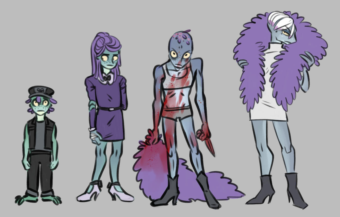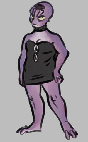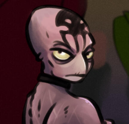 Darling began life as Max, a bright but unassuming indentured child laborer working on the crew of a Nolybab daytime television studio. Whilst working on set filming an interview, the young mud’s purple feathers caught the eye of the interviewee: the fashion magnate Mizz Malthea Mayven Uggae. Before the interview was over, the Prima Glokka had Max’s life signed over to her estate, and the rest was history. The Mudokon known as Max was no more, and in his place was Mayven’s newest project: Darling.Over the course of growing up at Mayven’s side, Darling would go through countless surgical procedures to shape her into a more fashionable specimen than the plain little boy she used to be. In the end, the only thing that was still originally hers was her feathers; those were regularly plucked and regrown at Mayven’s behest, to provide all-natural materials for her new feather stole. This was the real project Mayven was spending her free time on, not Darling. Nevertheless, Darling worked herself to the bone to be the perfect handservant and companion to her Mistress, in hopes that she would still have a place at her side long after the stole was finished.As the years went by, Darling would go through countless faces to keep up with the Vykker-run beauty standards of crimps. Becoming something unrecognizable in the mirror didn’t bother Darling, who had willingly carved parts of herself away to fit the mold Mayven didn’t even order her to fill. Anything to have meaning in her life, deprived of the mental stimulation and creativity that her brilliant mind craved. Not wanting to bother with a stressed out mud, Mayven did what any slave owner with a limitless budget would do, and had a custom domestic Shrink ordered to be Darling’s new handler. Within twenty minutes of meeting her Shrink ‘Angel’, Darling had cracked open the parameters of its AI programming and ordered it to consent to her taking it apart.As Mayven was often absent from her own mansion on endless strings of business trips, social gatherings and extended vacations, Darling was often left behind to look after the estate. While she enjoyed having the privacy to continue tinkering with her Shrink, she craved the validation of her Mistress more than anything. Visits from Mayven became fewer and farther in between, and her attitude towards her own servant was dismissive at best. The only semblance of attention she spared her was to keep taking her feathers, but as the repeated plucking went on, fewer feathers were growing back. After a series of hit-or-miss feather treatments, Darling’s scalp had been left worse for wear. Still, she endeavored to provide for her Mistress’ personal project, even if her paranoia over being simply discarded grew.As the stole neared completion, Darling’s mental state worsened. Her paranoia and delusional symptoms were caught early by her shrink’s assessment, but in her fear of being replaced, Darling reprogrammed the Shrink to give her a perfectly clean bill of mental health upon reporting to Mayven. Darling’s issues were left to simmer, until at all came to a head upon one rare visit by her Mistress.It is uncertain what happened to Mayven, as Darling wasn’t in a lucid state of mind by the time she had the scissors in her hand. She killed the Mistress she loved, feared, and hated with equal measure, but it did not free her. No one like Darling could ever be ‘free’, changed too drastically both physically and psychologically to be the perfect, neglected pet she had become. So, she did the only thing that made sense to do: simply make it as though nothing ever happened to Mayven at all.For a savant like Darling, rigging a new AI out of Angel’s programming was almost too easy. Using recorded footage, clever editing, and utilizing Mayven’s famously busy schedule, she could digitally take Mayven’s place from the comfort of her own room. For the next six years, Darling and Angel would co-opt the Mayven persona to attend her meetings, conduct her business deals, and even arrange her personal affairs with Glukkon men. No one was the wiser, because after all, Darling was only one Mudokon - one very smart, very cunning Mudokon, who would do anything to keep the status quo.Darling had traded her freedom for Mayven’s life, though not in the way she intended. Even in death, her Mistress ran her life to the most minute detail; everything Darling did was in service to keeping up the grift of Mayven’s ‘life’, while Darling herself continued to languish away in a room she would never leave. Her Shrink, no longer her caretaker, had been reprogrammed into an idealized, sycophantic version of Mayven that would love Darling back, just as she always wanted. To her, this ghost occupying the robotic shell was more real to her than the memory of a dead woman who only ever neglected her.Darling was prepared to die keeping up this grift for the rest of her days, until the cracks in the facade became apparent to the even more paranoid and deranged conspiracist Wittly, who brought ‘Mayven’ to the attention of the Rebel Defects. While they infiltrated Mayven’s estate looking for answers, they didn’t realize they would be led to a single, self-imposed hermit of a crimp, conducting Mayven’s ‘lie’ through a wall of computer screens. They also didn’t realize that they may as well have saved Darling’s life.