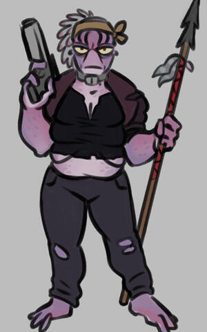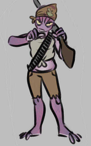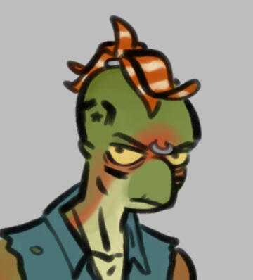 He was mockingly given the nickname “Drill” by the other Mudokon delinquents in the Barracks. Drill insists that the nickname comes from his job as a maintenance Mud and skill with power tools, but the nickname actually stuck as a result of his constant insulting and scolding of other Muds much older and larger than him, with a confident gusto not unlike the drill sergeants they were faced with every day.The “Target Practice” jumpsuit is standard issue for Mudokons in the Delinquent Camp. The Sligs in the Barracks entertained themselves greatly by aiming directly for Drills peg leg every time he was sent out on the shooting range to pick up bullet shells. It became a game for them. After going through leg after leg made of rusty rods leftover from outposts and wrappings made from empty sandbags, Drill eventually started making his spare legs out of weapons that were tossed into the Barracks’ “discard pile” for reasons such as malfunction or obsoletion. Drill will darkly comment about how the guns his leg are made from are just like him, “thrown away for not working right.”When Abe first arrived at Slig Barracks on his mission to shut down SoulStorm Brewery 401, Drill had no interest in following Abe. He didn’t believe in some Messiah, and he certainly didn’t believe in blindly following some leader to become an off the grid hippie. The murder of General Dripik cracked Drill’s skepticism. He still didn’t believe in Abe’s prophecy, but Howler's grit won him over. He decided to trust Abe and Howler and go with them on their journey (after stocking up on an overly excessive amount of stolen Slig artillery per Howler’s request, much to the dismay of Abe). He was sent through a bird portal by Abe after the death of Vice President Aslik. Freedom however, did not result in Drill’s attitude improving. If anything it got worse. After the Brewery’s destruction, Drill became the first official member of Howler’s “Rebel Defects”. He did not fit in well with the freemuds let alone the natives, he even managed to receive the luck of being the first Mudokon that was ever kicked out of Alf’s Rehab & Tea after giving the namesake proprietor a very harsh, unwarranted, but not dishonest tongue lashing. He began being turned away from most front doors, not that he seemed to care, but it was clear he didn’t fit in.He inadvertently joined Howler’s mission to assassinate her oppressors when she coaxed him into realizing they both wanted the same thing; to kill the Industrialists that murdered their childhoods, no matter how small or indirect a role they played in it. In order to convince him that Howler had his best interest in mind, she gave Drill her collection of General Dripik’s medals, a trophy she had taken from the Glukkon warmonger’s dead body the day that he had been murdered as an ironic quarmic vengeance on behalf of the spear belonging to her Drone Beget being turned into a centrepiece in Dripik’s trophy room. Giving up the medals to Drill was a meaningful gesture, as the murder of Dripik was something Howler had longed for since the Glukkon’s army razed her tribe into the ground and abducted her. The medals were, to her, a reminder that she had outlived him, her tribe had outlived him.Drill keeps the medals adorning whatever he can show them off on. He is the weapons specialist of the gang. Thanks to his non-consequential career in maintenance, excessive time spent in Slig Barracks, and his experience jury-rigging prosthetics out of reverse-engineered Slig weaponry, his knowledge of industrial firearms is practically unmatched. He is skilled with both a close range handgun and a long range sniper rifle, and can identify any bullet, even if the shell is mangled.As the youngest member of the gang he is constantly on edge about being patronized. Though Howler sees her younger teenage self in Drill, caring deeply for him and understanding his pain, the majority of their interactions result in arguments and insults thrown at one another. Thanks to the Delinquent Camp he is an expert at interrogation tactics and is quick to harshly clock people on their Slegshit, even his own gang. He does not respect Howler as a leader, and is the only member who tends to call her out when her motives are clearly favouring herself over others.His second closest relationship is with Trip Hazard, who trusts Drill the most when it comes to describing the appearance of things like dead Sligs; something the two of them both find quite hilarious.