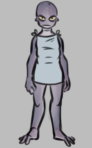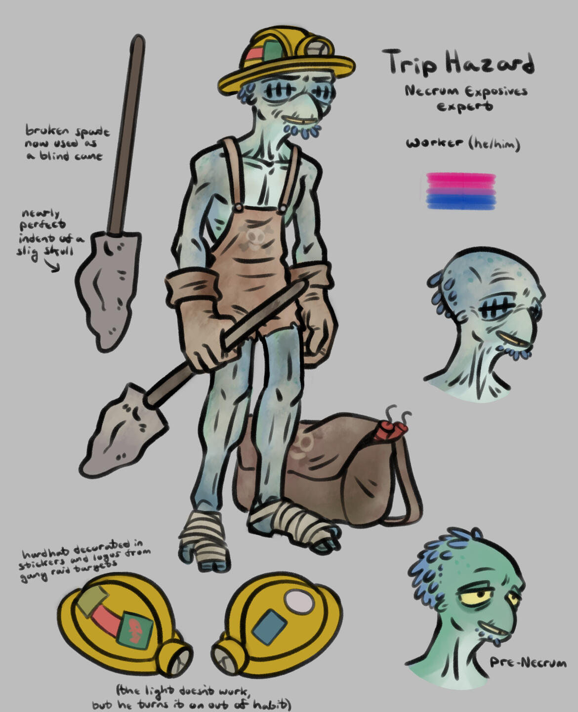 Ever since he was a hatchling, he never looked where he was going and was always stumbling about in the way of others, earning himself the nickname “Trip Hazard”. After spending his able-bodied years slaving away with explosives in various locations under the orders of SoulStorm Mining Co., he was eventually shipped off to Necrum Mines under the facade of a “promotion”. It became clear to Trip that this was a lie when he was knocked unconscious and had his eyelids sewn shut before being thrown into a Cheapo Labour train car without any care whatsoever.Mudokon slave miners in the lowest levels of Necrum are all surgically blinded before they are stationed there, for various reasons. One being that any burial offerings dug up by the slaves are confiscated and sold to Industrialist museums as “excavated artifacts”. Deprivation of sight ensures the slaves don’t have the chance of seeing anything valuable while they’re digging and trying to pocket them. Also, if they become aware what species the bones they’re ordered to dig up belongs to it would likely cause the workers great moral distress, which could lead to panic attacks or suicide, and their bosses don’t want to deal with that paperwork. The blinded slaves are also deprived of sunlight as they are never permitted to leave the low tunnels of the mine. The lack of sunlight and oxygen causes their skin to become very thin and pale. If a blinded slave was even seen at a glance by someone who wasn’t supposed to see them, it would be a PR nightmare for the mining company, so they’re kept underground, essentially until they die and become the very bones being dug up. In short, slave miners being promoted to work in Necrum Mines are being sentenced to death.Trip Hazard was always very aware that Necrum would become his grave, but always remains very lighthearted about it all. He was well known by his coworkers before for his sense of humour, always cracking jokes even in the most dire of situations. When dumped off at Necrum he was typically working on his lonesome by order of Morguer, who demanded that all explosive technicians be sent on location alone in order to minimize casualties. Trip was fully expected to die on multiple occasions, but he has managed to evade death every time with a smile on his face and a bird flipped to his Slig supervisor.Explosives remained Trip’s one and only comfort. He was already half deaf due to his work and was now fully blind, meaning he couldn’t at all see the bright fiery clouds and couldn’t much hear the boom beyond a ringing in his ears. However he could still feel the explosions. The vibrations in his bones that shot through him after detonation were more familiar to him than a cold Brew or a good night's sleep. He often mentions that his lifelong dream is to go out with a bang in the biggest, brightest, most destructive explosion possible and that all the previous explosions he’s been in “clearly weren’t sexy enough”.When Abe caused Necrum Mines to cave in, it was Trip Hazard himself who aided in laying the explosives to do so. Unlike Drill, Trip Hazard didn’t hesitate when offered rescue by Abe. However, not unlike Drill, he didn’t fit in with the other freemuds and natives well. Not many of the blinded Mudokons did as the tribes themselves weren’t used to large populations of disabled and were not equipped to provide them necessary aid. Trip’s age didn’t do himself any favours either. As a crotchety blind old Mud, he expected to be treated with respect by the tribes as they seemed to value their elders. The contrary proved quickly true. His status, not only as a factory-hatched Mud but one that contributed to the “defiling of Necrum” earned him frequent disrespect and saliva spat in his direction by Posers, Kahonees and Shamans.He quickly learned that the only place he was truly welcome was in Howler’s circle of screw-ups, and when the offer to join her mission of retribution was given to him he jumped to take it.His contribution to the Rebel Defects is his both his nasty sense of humour and expertise in explosives. When rescued from Necrum he made sure he took as much dynamite as he could with him, “just in case” as he put it. He always seems to have the exact explosive the gang needs, whenever, wherever, however, just by reaching in and pulling it out.The mining hardhat Trip wears has a broken light. Trip is unaware it’s broken and still switches it on whenever entering any dark areas with the gang, despite the fact he wouldn’t even be able to see with the light anyway. It’s merely a habit he never let go.He also carries with him a shovel he uses as a walking stick, perfectly indented with the shape of a Slig’s skull- one that had cornered Howler the day that Abe had come to the mines. Trip gave the Slig a quick whack knocking him dead to the ground, an act which stood as his first introduction to Howler and the Mudokon Messiah himself.Trip’s strongest relationship is with Slogmeat. He is completely oblivious to the fact Slogmeat isn’t actually a Slog. The gang doesn’t bother to correct him because Trip doesn’t believe them when they say Slogmeat is a Mudokon.