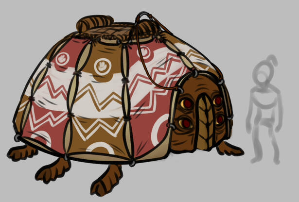 Unlike other tribes with strong connections to a spiritual animal, Mudellans openly raised meetles as livestock, evoking ire from some of their neighbors. For the Mudella, their use of meetle meat and materials was perfectly in line with Mudokon animism; meetles were so docile to them that they trusted the Mudella only - not the land rex, or the sleg, or any other predator - to partake of their mortal bounty. This belief has had its fair share of criticism, with some going so far as to compare it to the exploitative nature of industrial expansionists.
