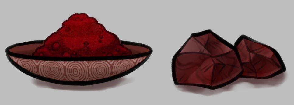 ‘Mudellan red’ is a rich, dark red pigment made from the regionally abundant semi-precious stone, rubynus. This opaque stone appears dull at first, but can be polished and shellacked with clear resin from young meetles to bring out its prized color. Polished rubynus is commonly used for jewelry, embellishments, charms and personal totems. Mudellan red as a dye adorned the tribe and their goods in excess; second only to the purple derived from a local wildflower colloquially (and incorrectly) labeled the Mudellan Violet.It is said that cultural fascination with these pigments comes from their similarity to the strong red feather genes passed on by their queens’ bloodline, and the tribe’s tendency towards developing purplish coloration. This claim is unverified, because there were just as many Mudellans that dyed their feathers and painted their skin their tribe’s emblematic colors. In truth, it was more likely due to the limited scope of their resources, and that importing other dyes was very expensive.