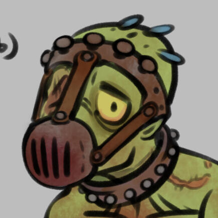 Mal wasn’t born, nor was he hatched, he was grown as a product of the Vykker Pharmaceuticals Universal Donor™ program, a horrific "medical breakthrough" that promised a consistent, conscious-free supply of transplant-ready organs that could be rented, leased, or sold. “75% ethically sourced Mudokon organ farms, incapable of conscious thought, pain, or suffering, for the discerning transplant recipient. All tissue is guaranteed cross-species compatible. Book a new liver or kidney today!” That’s what the brochure said. Mal was meant to be one of those, the 75%. Lifeless, unfeeling and disposable. But by a fluke, something didn’t take.When Howler’s gang raided one of the many Vykkers Labs in search for the notorious cosmetic surgeon Dr. Knicks, she instead found Malpractice on a steel table. Despite her first assumptions he was shockingly alive, eyes open, organs halfway removed, having been watching the procedure being performed on him in silence, before it was interrupted by gunshots. He sat up, gestured towards a suture kit, and stitched himself back together. Howler spoke to him, and it was the first time anyone had ever addressed him at all.His name comes from an identification tag that was tied to his toe, notifying the surgeon that was operating on him of something uncertain. Malpractice was the first word that Howler recognized. She asked the Mudokon if it was his name. Mal had never had a name before aside from the barcode identifier on his forehead, so he nodded.Mal is tall and bone-thin, stitched together like a ragdoll in surgical thread and steel staples. He’s a grotesque sight, the kind of figure even other Mudokons flinch away from. The Vykkers called him “it”, and the natives still do because they consider his existence “unnatural” due to having not been hatched from an egg.His gait is stiff, like he’s unused to moving under his own power (which is true). His muscles shouldn’t even work properly but, somehow, they do, and very well. Despite his stature his strength is impressive. He doesn’t feel pain due to his nerves having been grown to not have any sort of feeling. His skin is cold. His body is a patchwork of foreign parts, no one’s sure how many of them are even his. He doesn’t seem to know either, or care.He speaks very rarely, but when he does, his voice is low and precise, more like a readout than a conversation. He says that it’s because he doesn’t want to waste any words. His bedside manner is nonexistent, but in the field, no one can deny he’s effective. He knows how to keep others alive because he’s spent his entire life watching death happen in slow motion. He’s been an unwilling observer to countless surgeries, dissections, amputations-silent, motionless, always aware. The Vykkers never noticed. They never thought to check if the organ farm could see them.Mal learned from the inside out, both figuratively and literally. Within Howler’s gang, he puts that knowledge to use. He is the gang’s medic, though a more appropriate title would be their butcher. No one knows how much pain a body can take better than Mal. His cold precision and anatomical knowledge make him indispensable-if not exactly comforting. He doesn’t see suffering as something to prolong unless it serves a purpose. In fact, Mal is the only member of the gang who truly believes that sometimes, a painless death IS the only form of freedom left for a creature too far gone. He’s seen too much to believe otherwise.He doesn’t sleep. The only rest he’s ever known came in the form of cryogenic suspension. Without drugs, his body just keeps going, because there’s no fatigue in dead nerves. Unless he is artificially sedated with whatever Vykker Pharmaceuticals Knockout drugs the gang can get their hands on, he spends the night staring at nothing for hours while everyone else rests. Processing, remembering, and dealing with the traumatic reality of being alive. Mal doesn’t want revenge, he is revenge. Every scalpel, every suture, every Vykker executive with a missing kidney and a message carved into their chest is just another step toward something bigger, something final. He wasn’t made for war, but he’s very good at it.Mal wishes sometimes that he was capable of feeling pain, for the sole reason of being able to feel something at all. He’s unable to feel taste, touch, and can only barely feel temperatures. He isn’t even able to feel hunger despite his stomachs. He still prefers to eat through a pouch and a tube. He’s bitten off the tip of his tongue before and hadn’t even realized until Drill pointed out the blood coming from his mouth. He’s unable to feel sensations as well, and his artificial blood type was created for no reason other than being pumped by his lab-grown heart to organs that he wasn’t even allowed to keep.His bond with Howler is the only connection he’s ever had. She was the first person to see him as more than a “thing”. Not just a Mudokon but a person. He doesn’t know how to show what that means, of course. He’s never had a friend before her, but he follows her without question, protects her without hesitation, and if it ever came down to it, would kill every living thing in sight to keep her breathing. When the gang disagrees, he always takes her side.